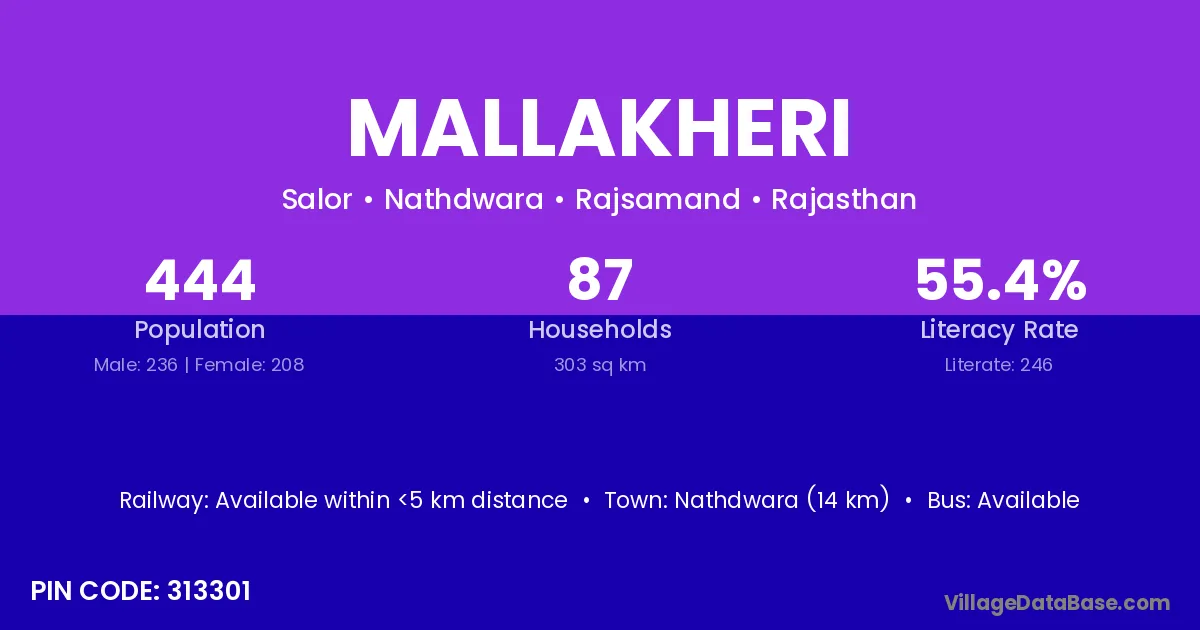 Nathdwara (14 km) is the nearest town to Mallakheri village for major economic activities and is located approximately 14 km away.