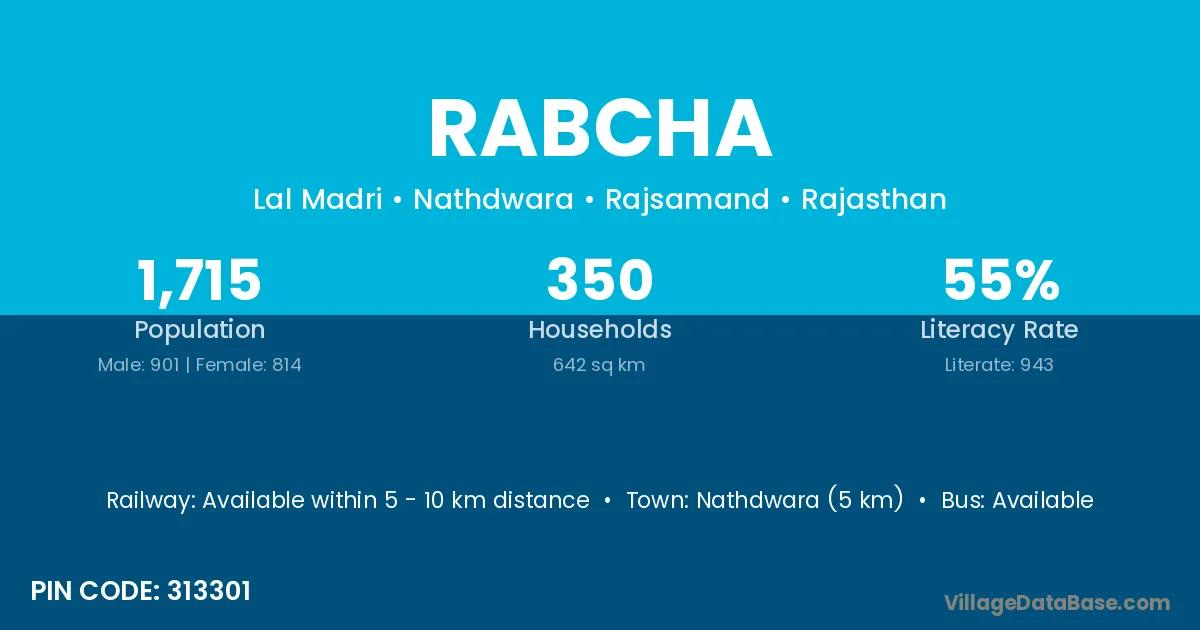 Nathdwara (5 km) is the nearest town to Rabcha village for major economic activities and is located approximately 5 km away.
