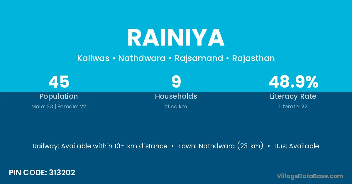 Nathdwara (23 km) is the nearest town to Rainiya village for major economic activities and is located approximately 23 km away.