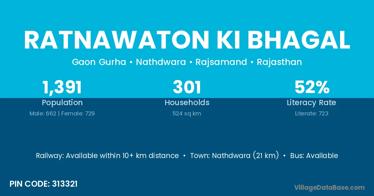 Ratnawaton Ki Bhagal village has a total population of 1,391 people, of which 662 are males and 729 are females.