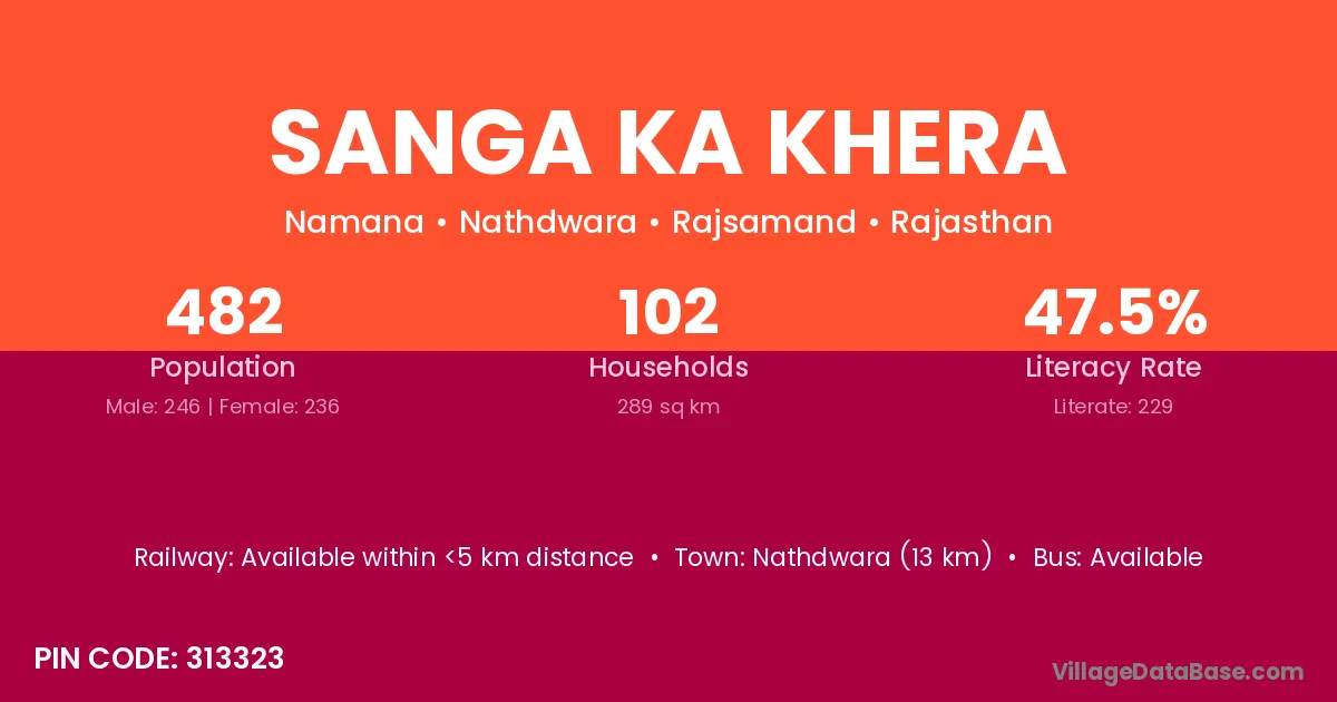 Nathdwara (13 km) is the nearest town to Sanga Ka Khera village for major economic activities and is located approximately 13 km away.
