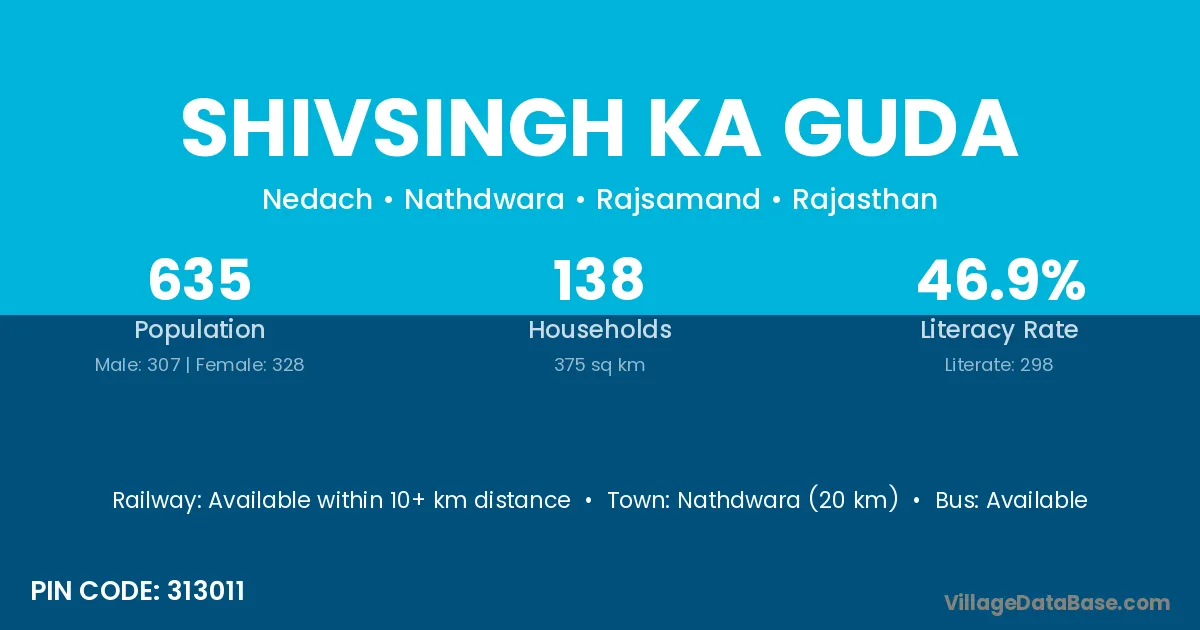 Nathdwara (20 km) is the nearest town to Shivsingh Ka Guda village for major economic activities and is located approximately 20 km away.