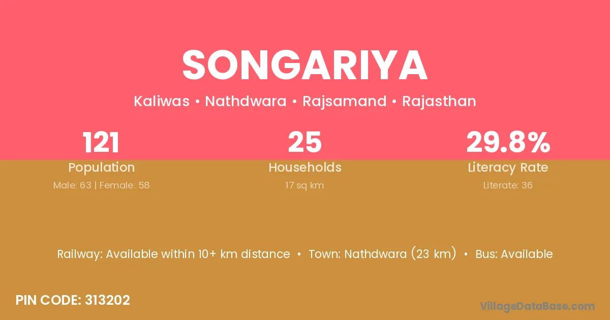 Nathdwara (23 km) is the nearest town to Songariya village for major economic activities and is located approximately 23 km away.