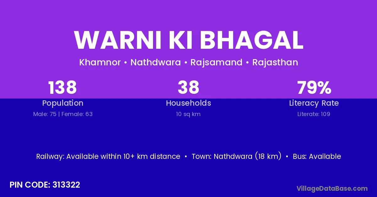 Nathdwara (18 km) is the nearest town to Warni Ki Bhagal village for major economic activities and is located approximately 18 km away.