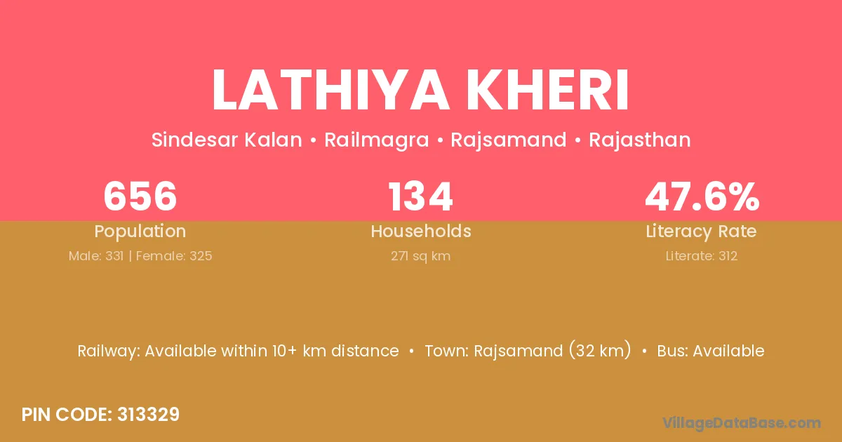 Rajsamand (32 km) is the nearest town to Lathiya Kheri village for major economic activities and is located approximately 32 km away.