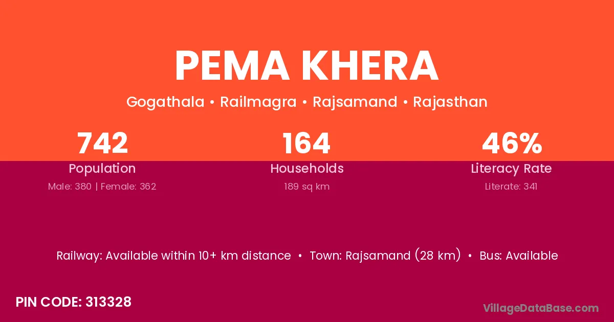 Rajsamand (28 km) is the nearest town to Pema Khera village for major economic activities and is located approximately 28 km away.