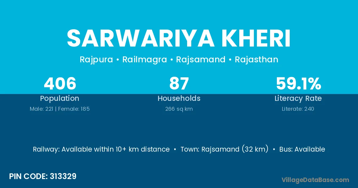 Rajsamand (32 km) is the nearest town to Sarwariya Kheri village for major economic activities and is located approximately 32 km away.