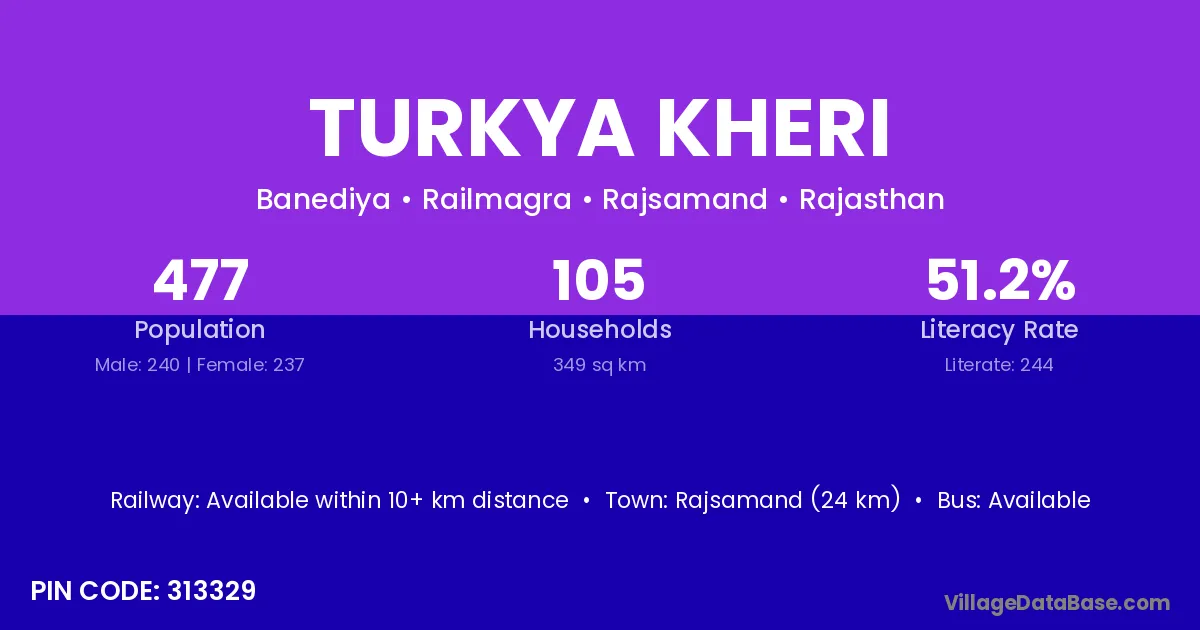 Rajsamand (24 km) is the nearest town to Turkya Kheri village for major economic activities and is located approximately 24 km away.