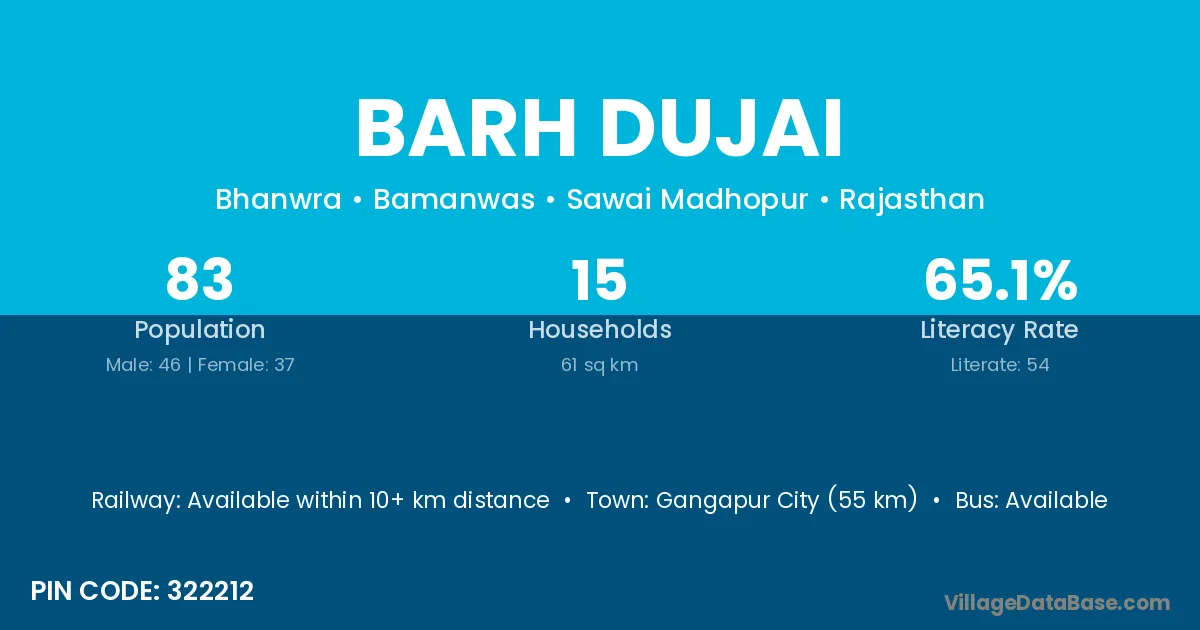 Gangapur City (55 km) is the nearest town to Barh Dujai village for major economic activities and is located approximately 55 km away.