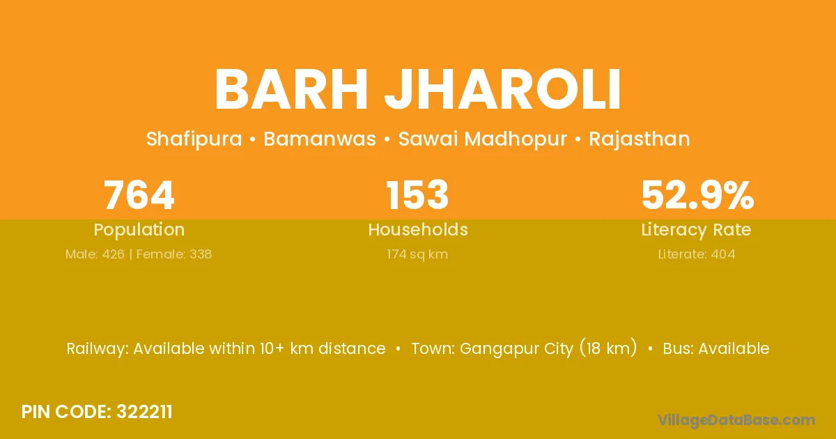 Gangapur City (18 km) is the nearest town to Barh Jharoli village for major economic activities and is located approximately 18 km away.