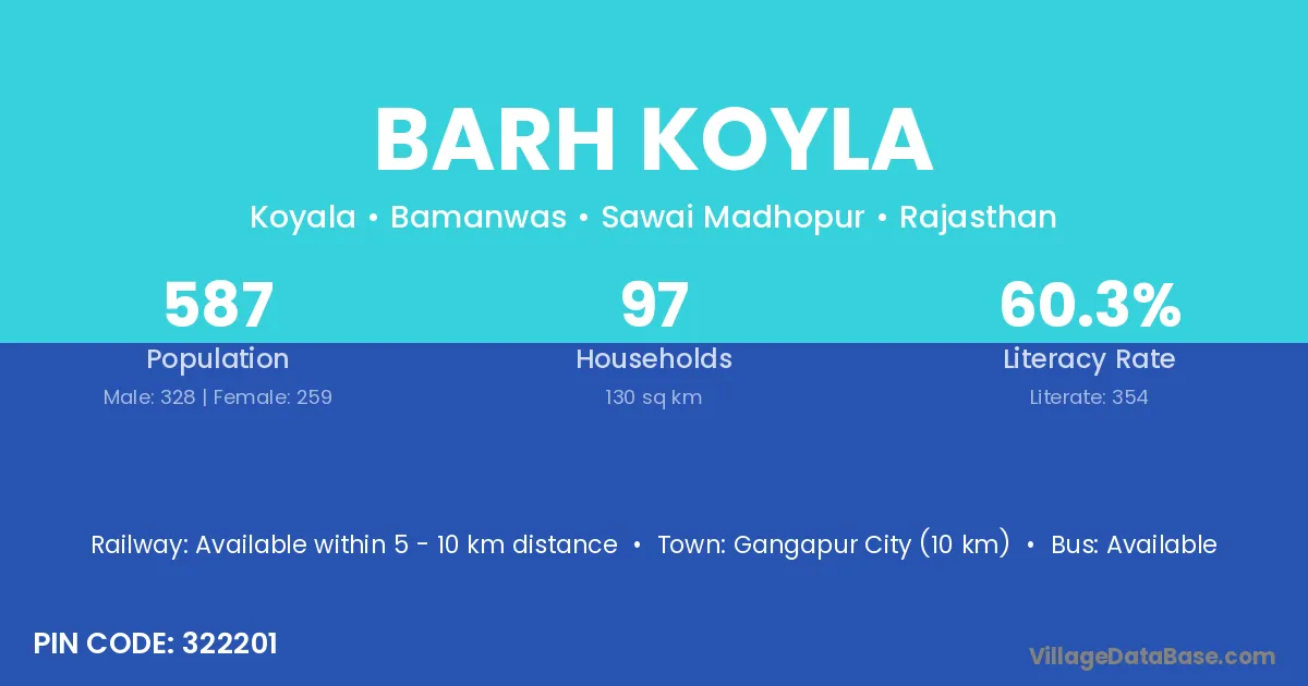 Gangapur City (10 km) is the nearest town to Barh Koyla village for major economic activities and is located approximately 10 km away.