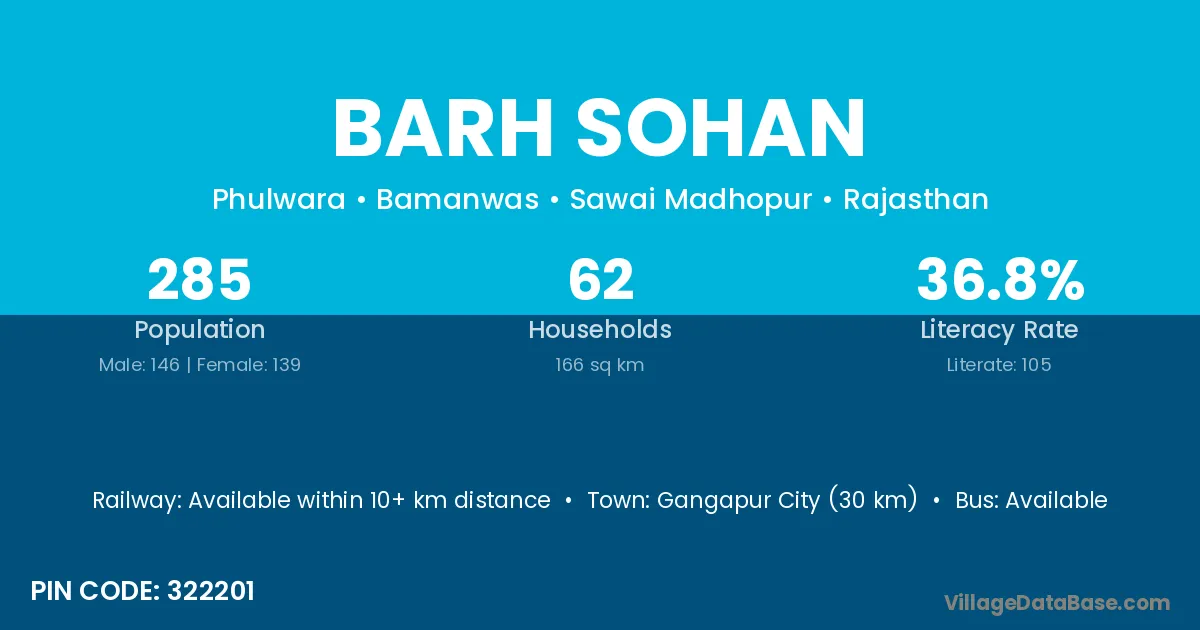 Gangapur City (30 km) is the nearest town to Barh Sohan village for major economic activities and is located approximately 30 km away.
