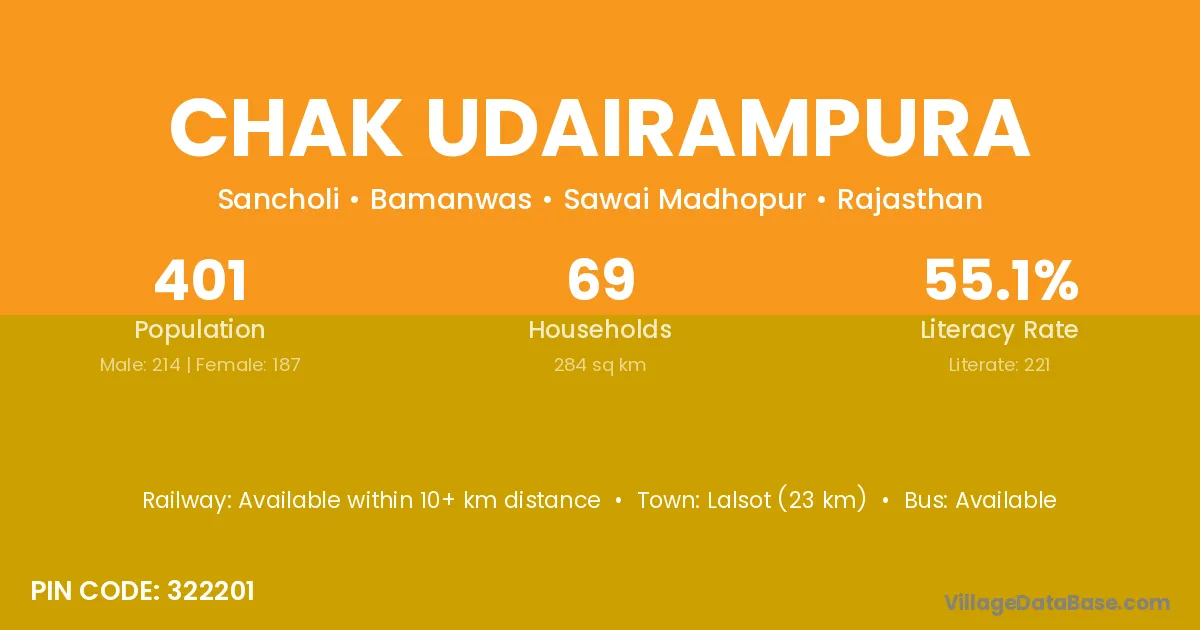 Lalsot (23 km) is the nearest town to Chak Udairampura village for major economic activities and is located approximately 23 km away.