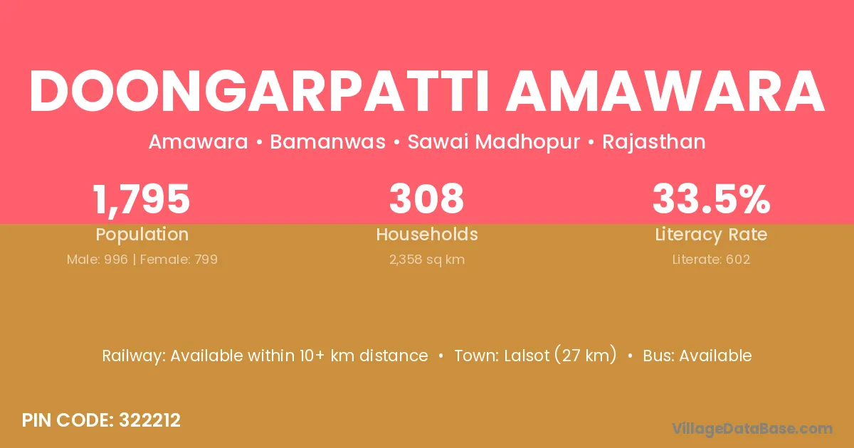 Lalsot (27 km) is the nearest town to Doongarpatti Amawara village for major economic activities and is located approximately 27 km away.