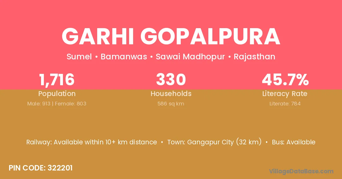 Gangapur City (32 km) is the nearest town to Garhi Gopalpura village for major economic activities and is located approximately 32 km away.
