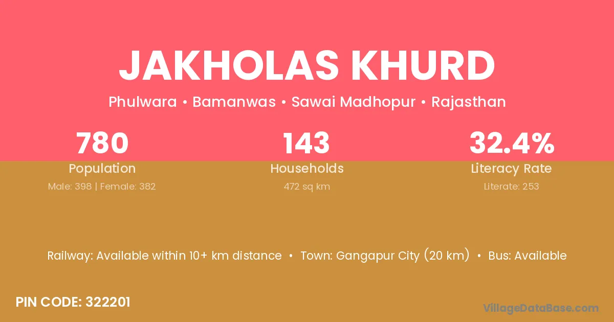 Jakholas Khurd village has a total population of 780 people, of which 398 are males and 382 are females.