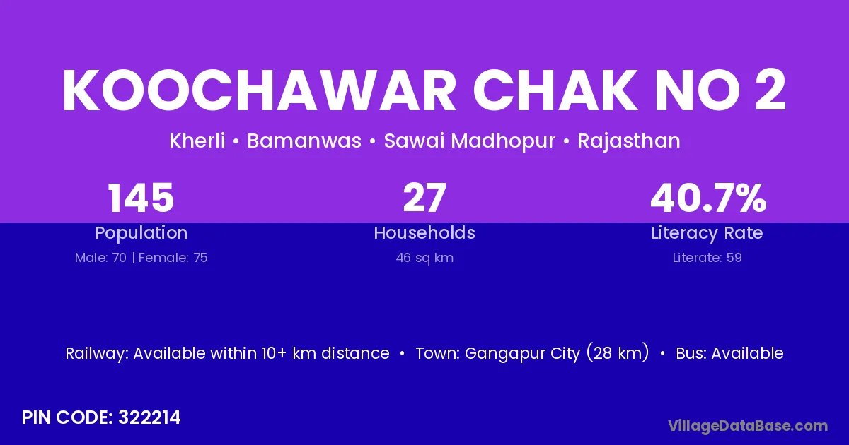 Gangapur City (28 km) is the nearest town to Koochawar Chak No 2 village for major economic activities and is located approximately 28 km away.