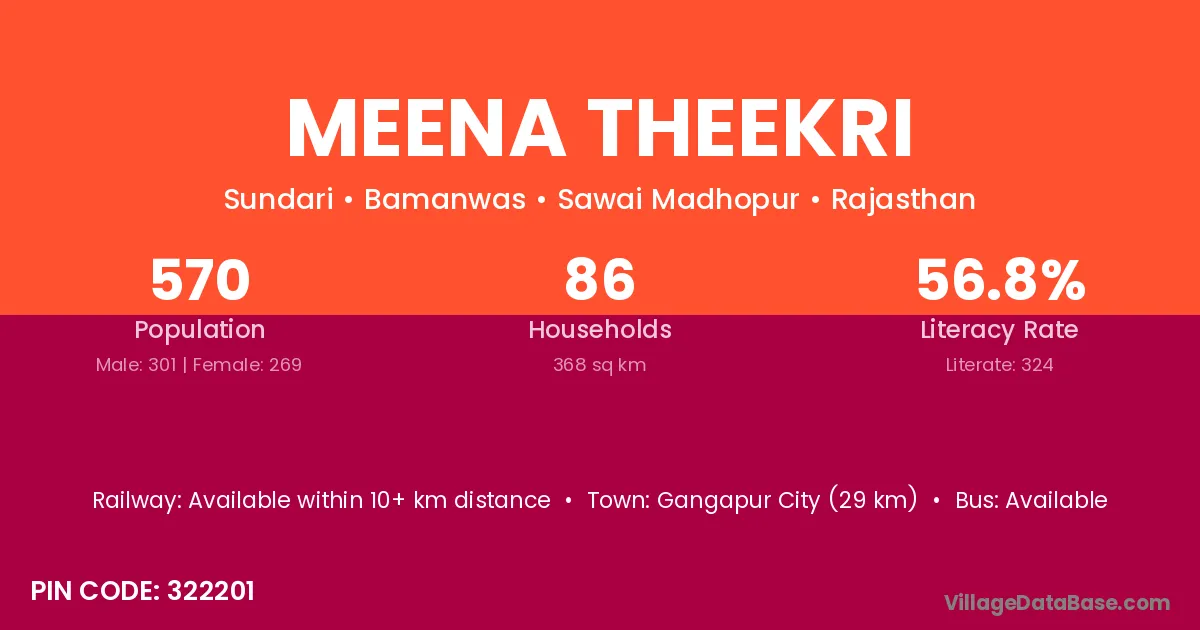 Meena Theekri village has a total population of 570 people, of which 301 are males and 269 are females.