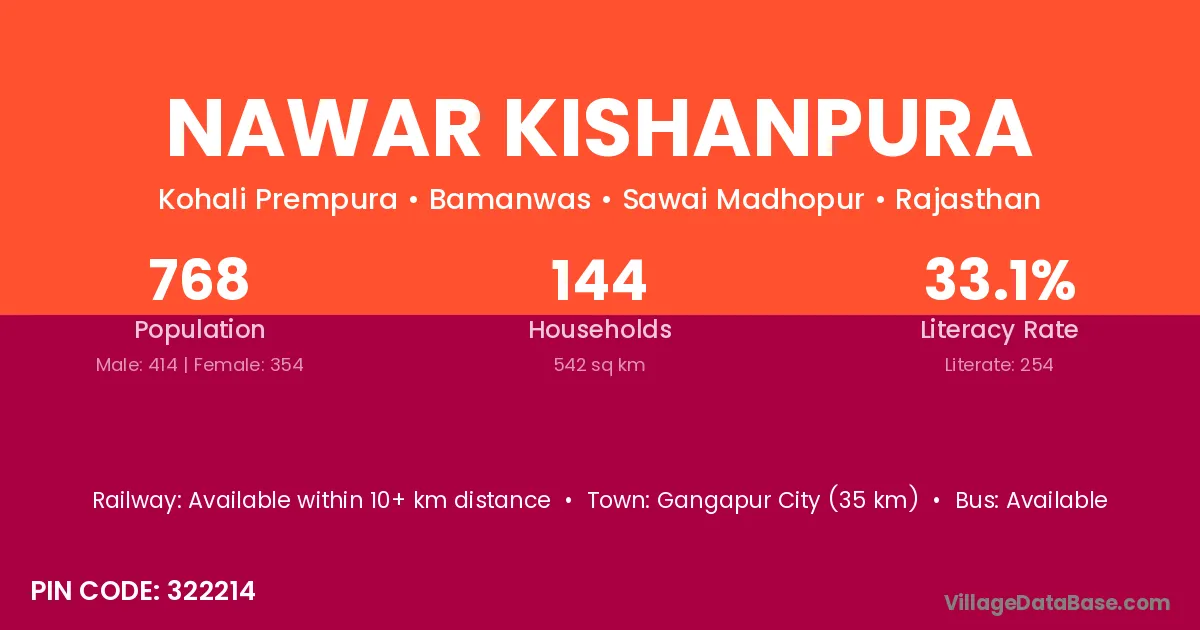 Gangapur City (35 km) is the nearest town to Nawar Kishanpura village for major economic activities and is located approximately 35 km away.