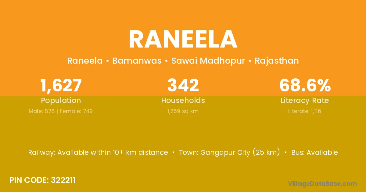 Gangapur City (25 km) is the nearest town to Raneela village for major economic activities and is located approximately 25 km away.