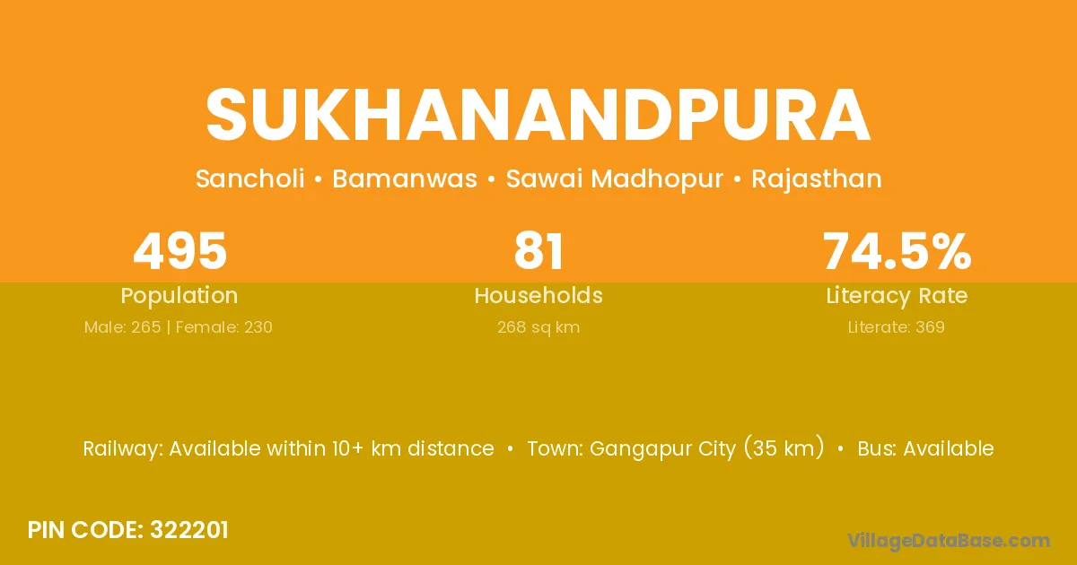Gangapur City (35 km) is the nearest town to Sukhanandpura village for major economic activities and is located approximately 35 km away.