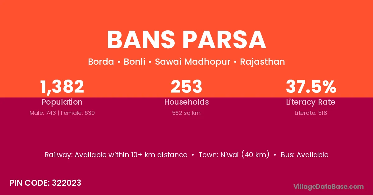 Bans Parsa village has a total population of 1,382 people, of which 743 are males and 639 are females.