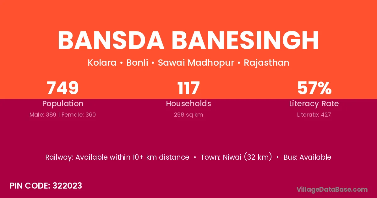 Niwai (32 km) is the nearest town to Bansda Banesingh village for major economic activities and is located approximately 32 km away.