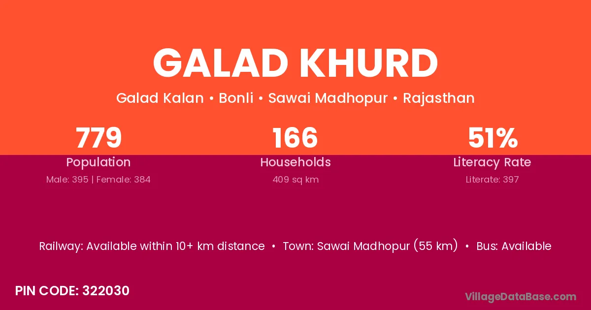 Sawai Madhopur (55 km) is the nearest town to Galad Khurd village for major economic activities and is located approximately 55 km away.