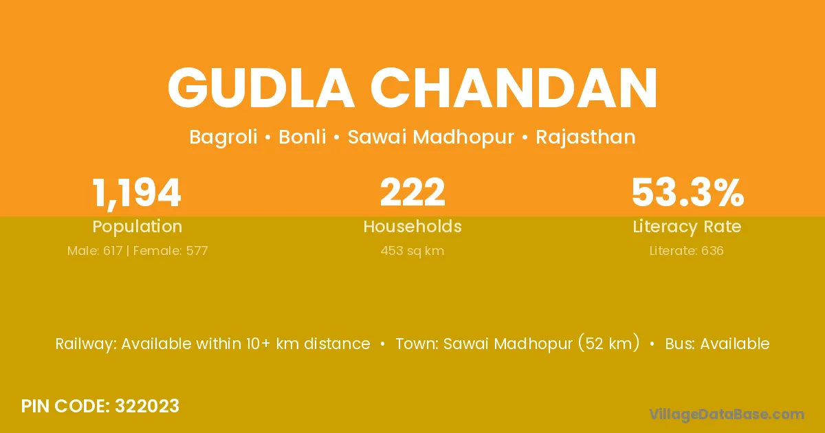 Sawai Madhopur (52 km) is the nearest town to Gudla Chandan village for major economic activities and is located approximately 52 km away.