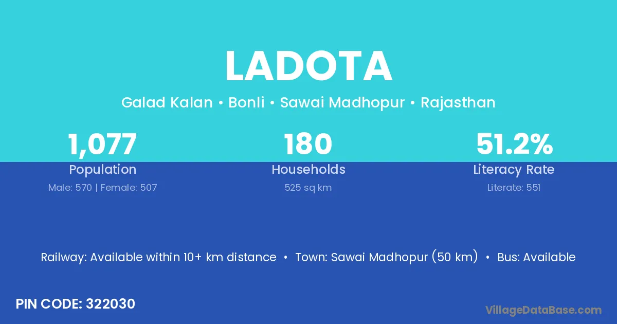 Sawai Madhopur (50 km) is the nearest town to Ladota village for major economic activities and is located approximately 50 km away.