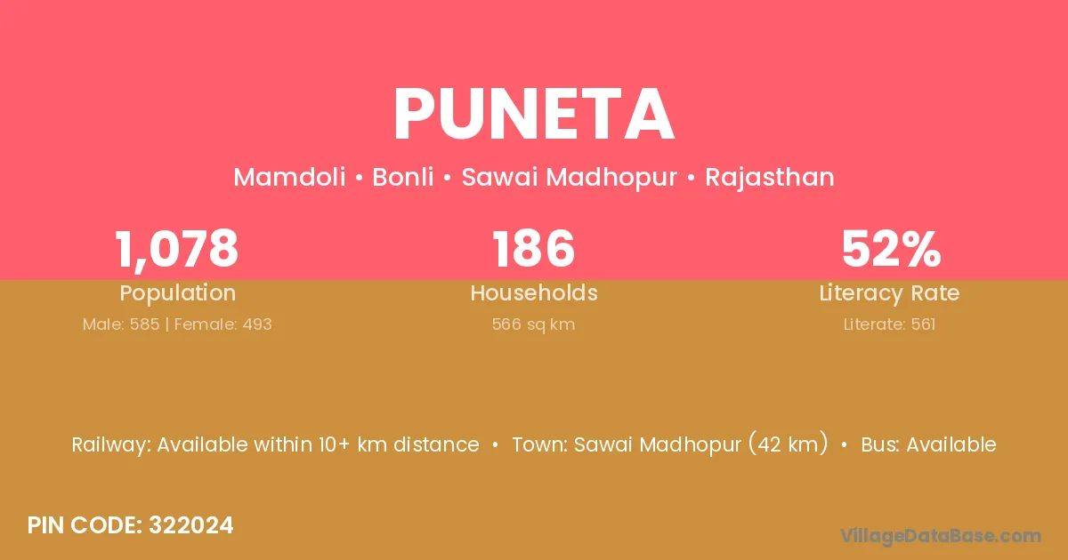 Sawai Madhopur (42 km) is the nearest town to Puneta village for major economic activities and is located approximately 42 km away.