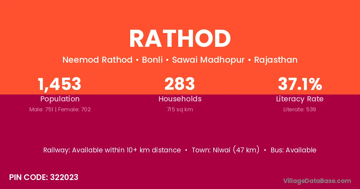 Rathod village has a total population of 1,453 people, of which 751 are males and 702 are females.