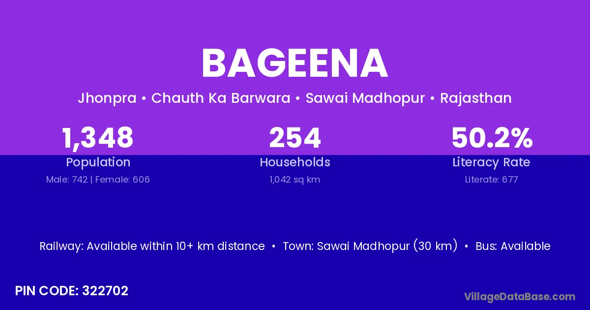 Sawai Madhopur (30 km) is the nearest town to Bageena village for major economic activities and is located approximately 30 km away.