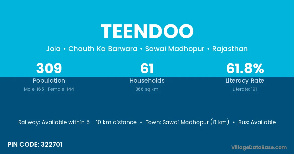 Sawai Madhopur (8 km) is the nearest town to Teendoo village for major economic activities and is located approximately 8 km away.