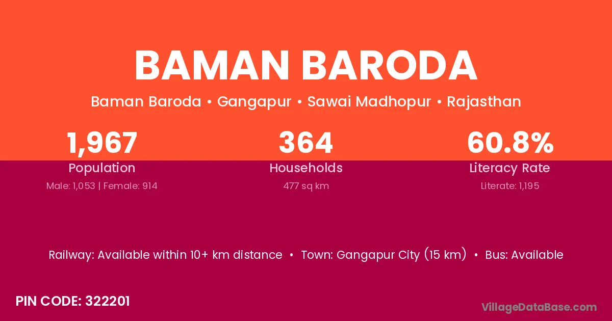 Baman Baroda village has a total population of 1,967 people, of which 1,053 are males and 914 are females.