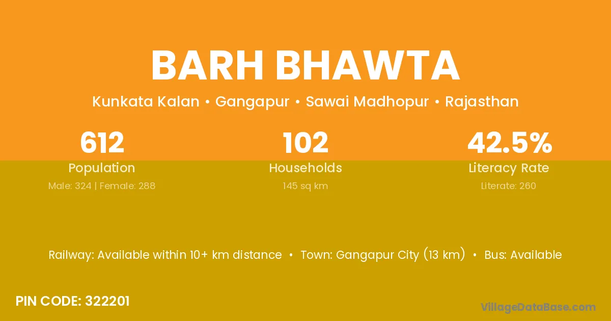 Gangapur City (13 km) is the nearest town to Barh Bhawta village for major economic activities and is located approximately 13 km away.