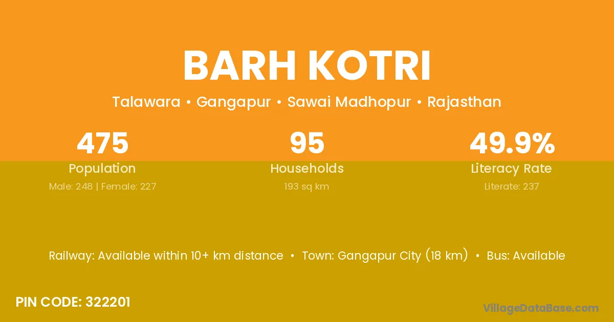 Gangapur City (18 km) is the nearest town to Barh Kotri village for major economic activities and is located approximately 18 km away.
