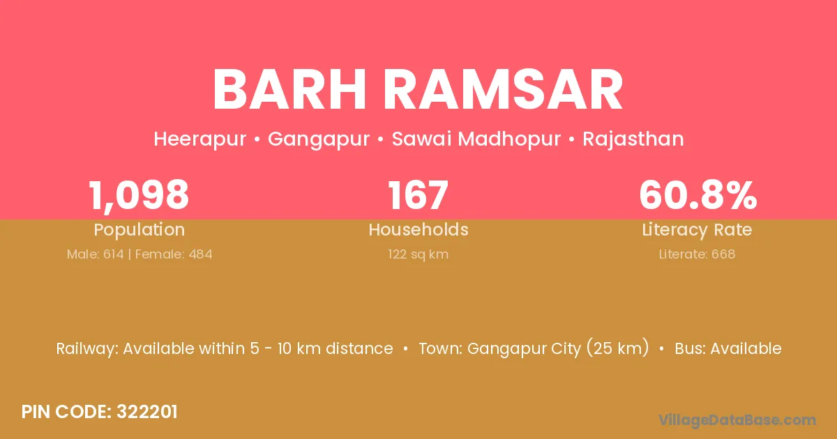 Gangapur City (25 km) is the nearest town to Barh Ramsar village for major economic activities and is located approximately 25 km away.