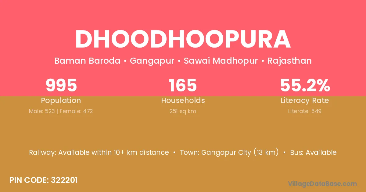 Dhoodhoopura village has a total population of 995 people, of which 523 are males and 472 are females.