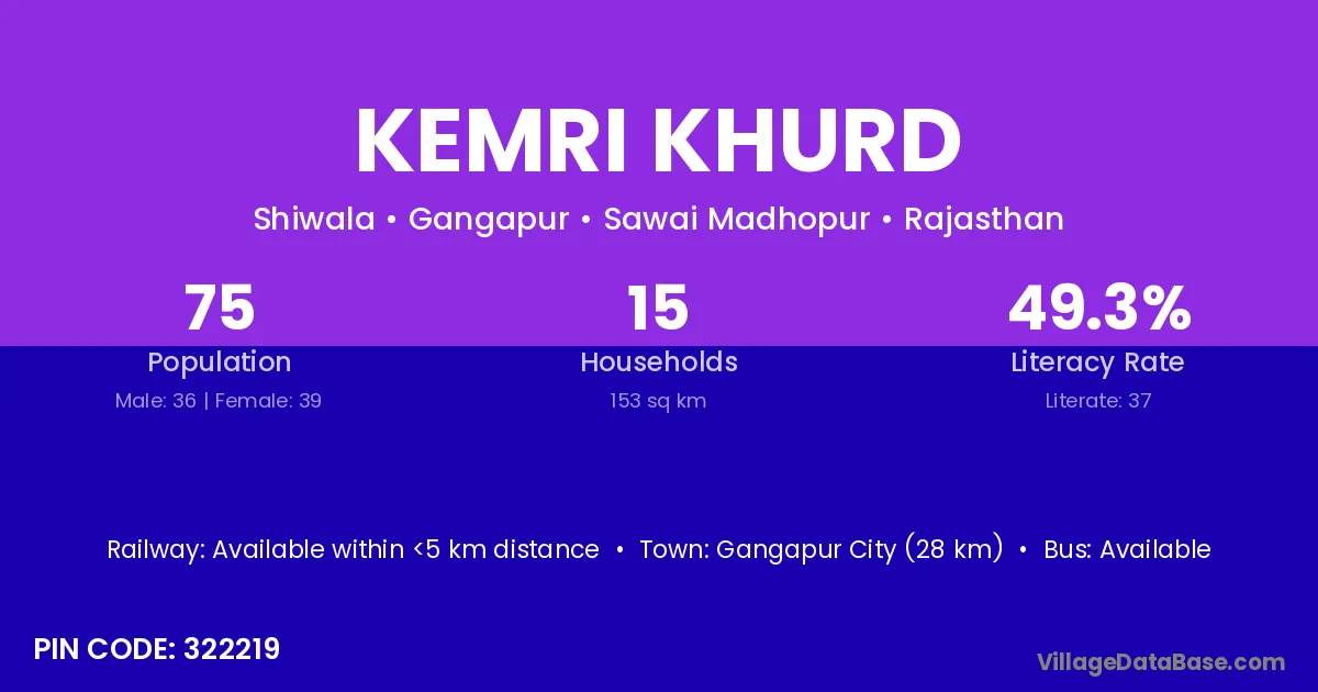 Gangapur City (28 km) is the nearest town to Kemri Khurd village for major economic activities and is located approximately 28 km away.