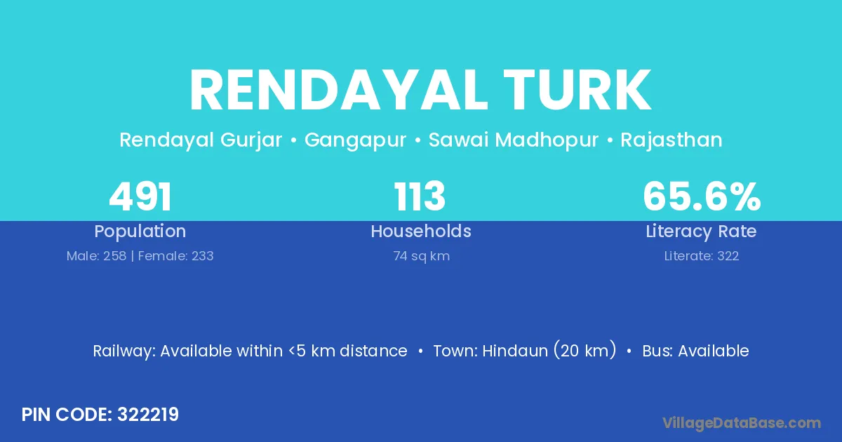 Hindaun (20 km) is the nearest town to Rendayal Turk village for major economic activities and is located approximately 20 km away.