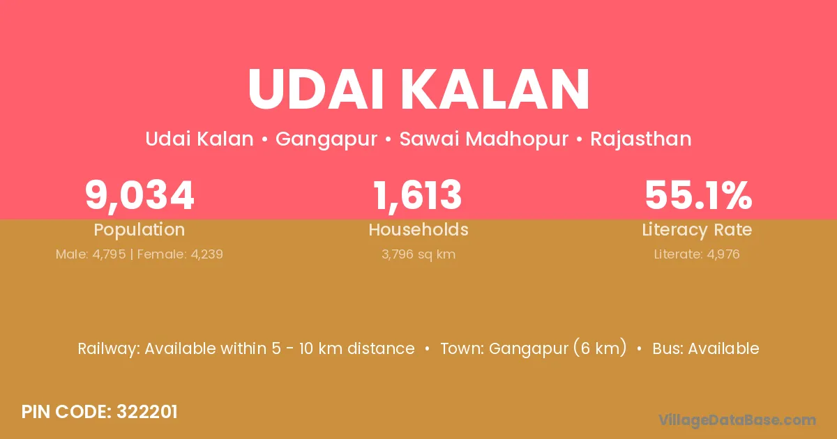 Gangapur (6 km) is the nearest town to Udai Kalan village for major economic activities and is located approximately 6 km away.