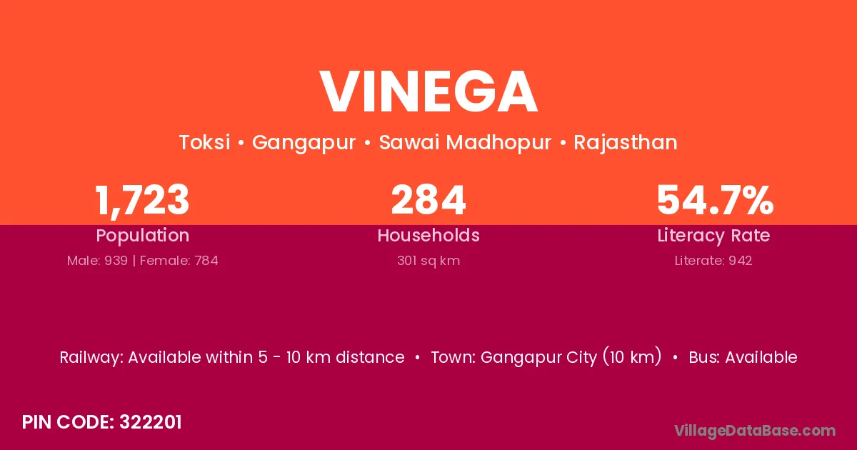 Gangapur City (10 km) is the nearest town to Vinega village for major economic activities and is located approximately 10 km away.