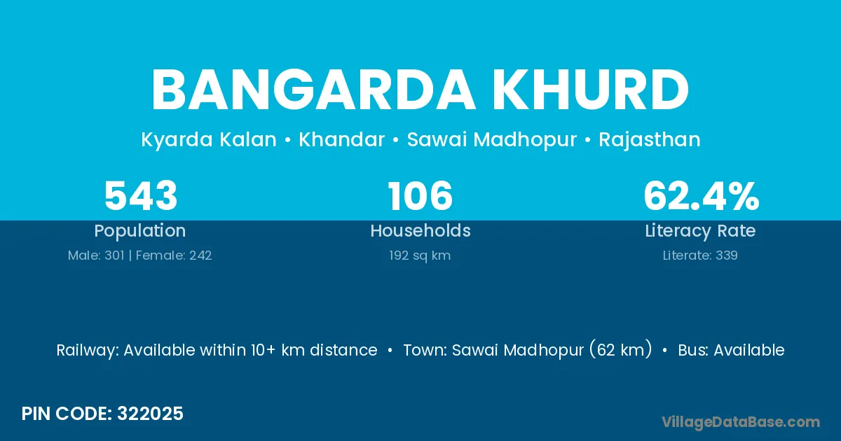Sawai Madhopur (62 km) is the nearest town to Bangarda Khurd village for major economic activities and is located approximately 62 km away.