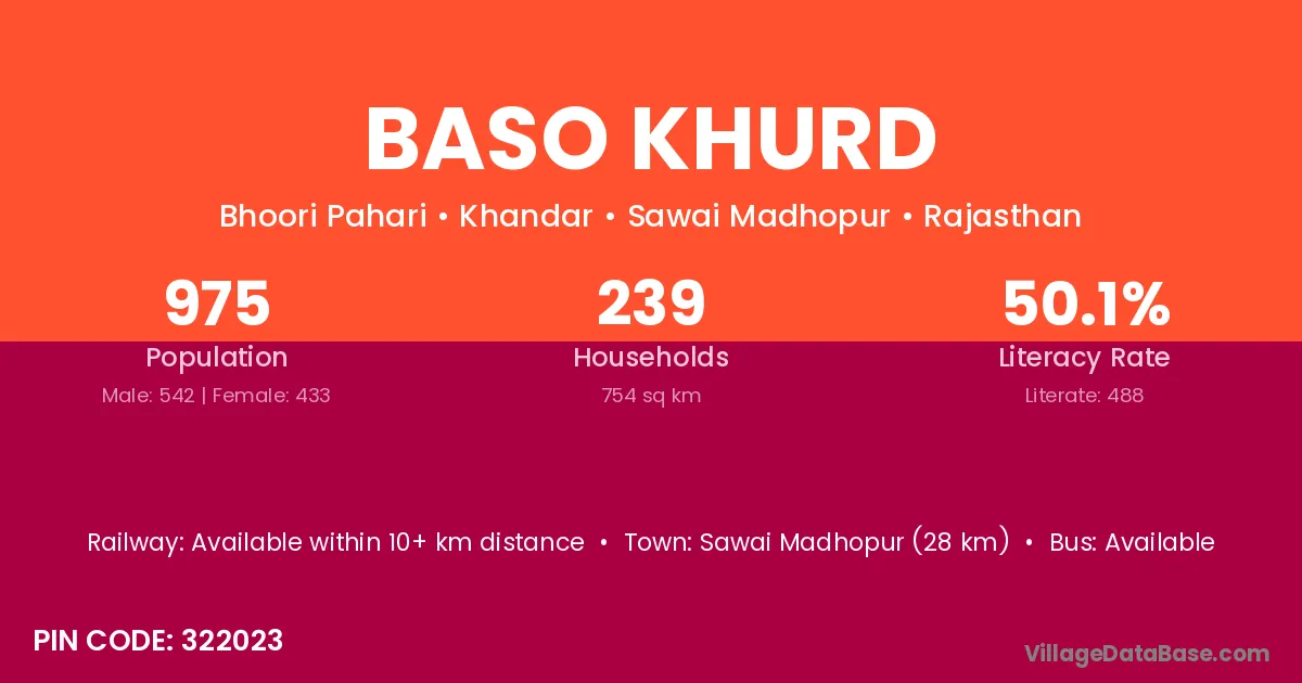 Sawai Madhopur (28 km) is the nearest town to Baso Khurd village for major economic activities and is located approximately 28 km away.
