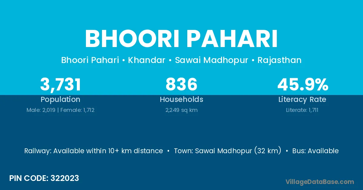 Sawai Madhopur (32 km) is the nearest town to Bhoori Pahari village for major economic activities and is located approximately 32 km away.