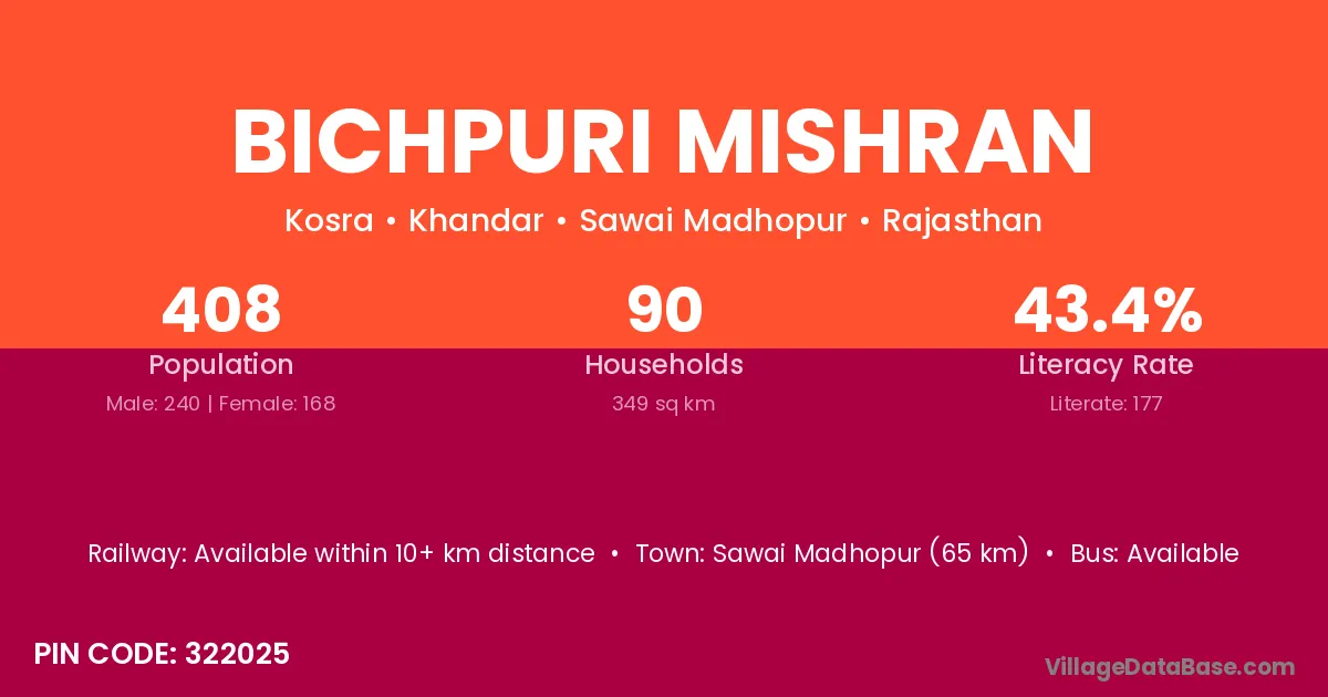 Bichpuri Mishran village has a total population of 408 people, of which 240 are males and 168 are females.