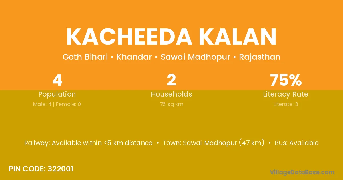 Sawai Madhopur (47 km) is the nearest town to Kacheeda Kalan village for major economic activities and is located approximately 47 km away.