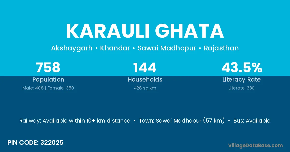 Sawai Madhopur (57 km) is the nearest town to Karauli Ghata village for major economic activities and is located approximately 57 km away.