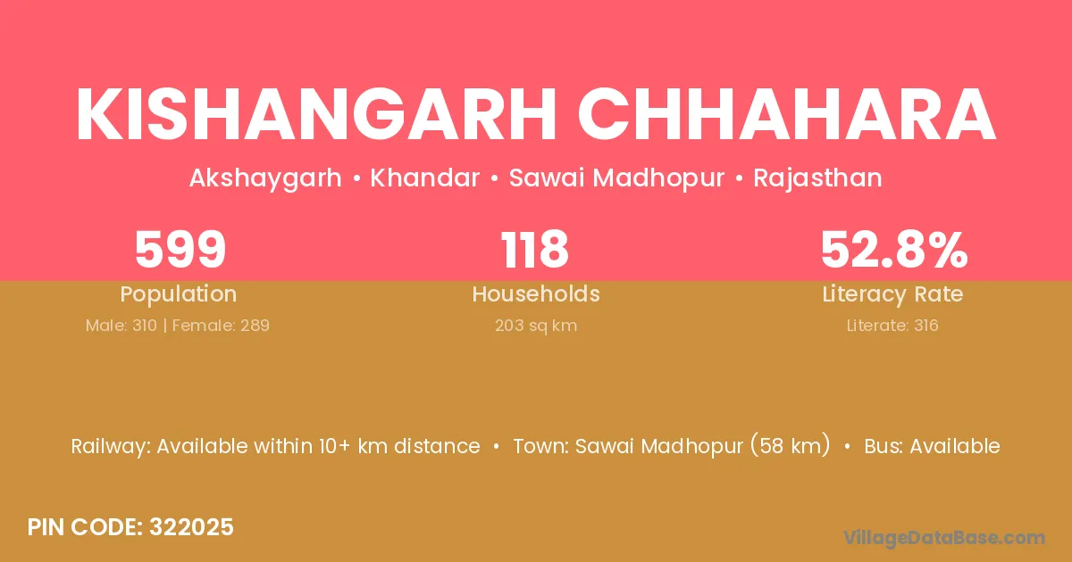 According to Census 2011 information, the village code of Kishangarh Chhahara village is 322025.